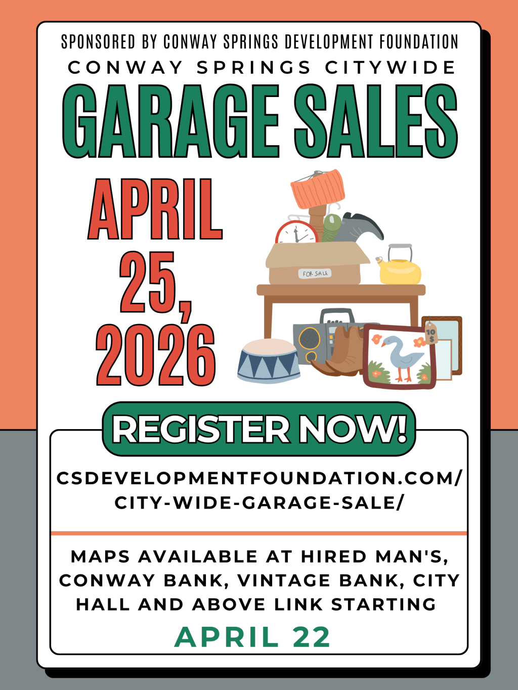 The Citywide Garage Sale for Conway Springs will be Saturday, April 25, 2026.